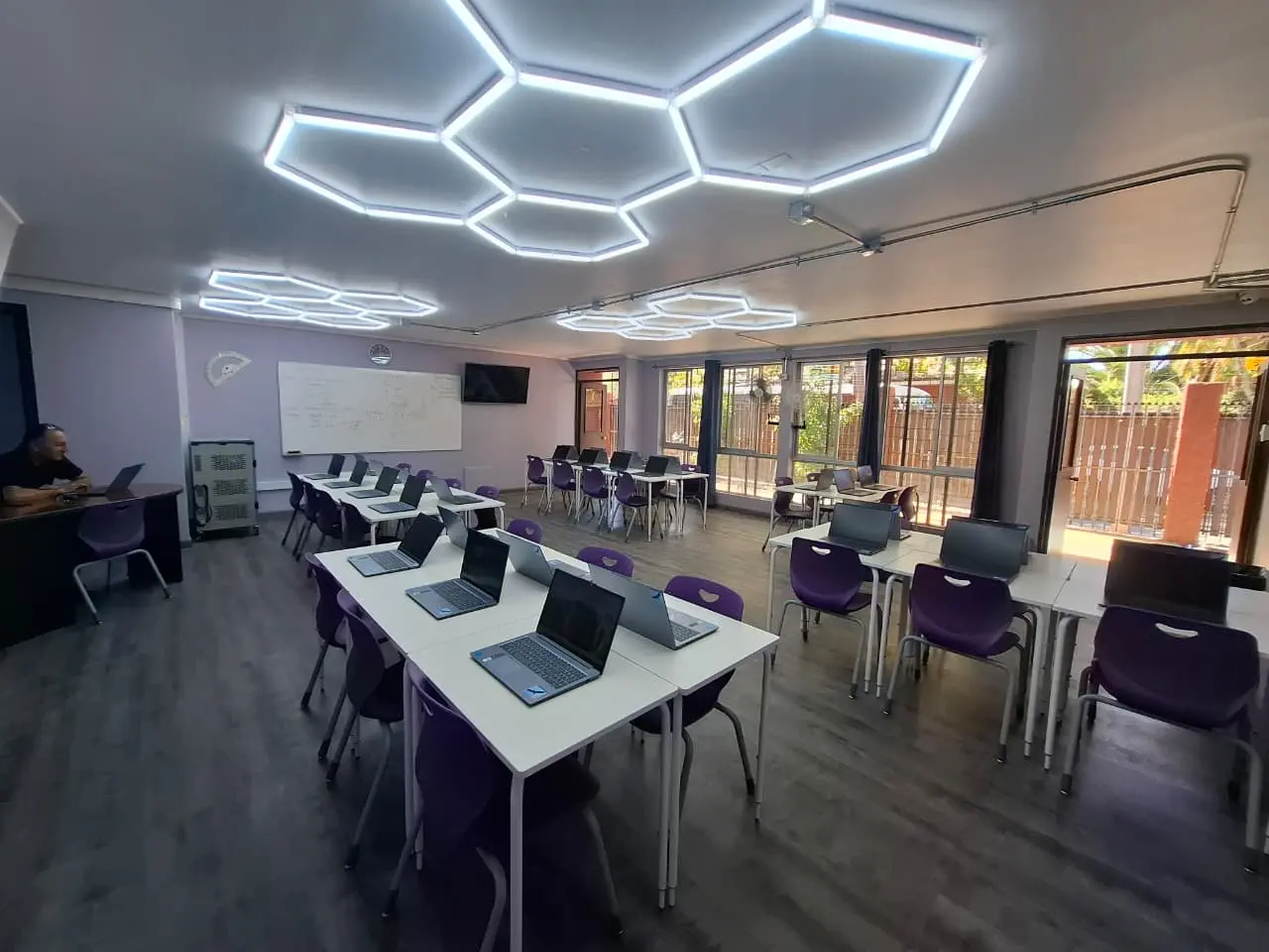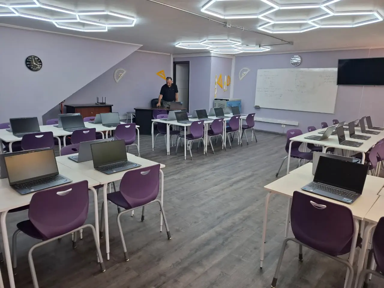 Esta sala cuenta con mesas de trabajo colaborativo personalizadas, pensadas para que el respeto y la sinergia fluyan entre compañeros. Hemos integrado carros de carga para computadores, asegurando que la tecnología sea una herramienta disponible y ordenada para enfrentar los desafíos de una sociedad globalizada. Todo esto, bajo una iluminación diseñada para mantener la concentración y el bienestar.