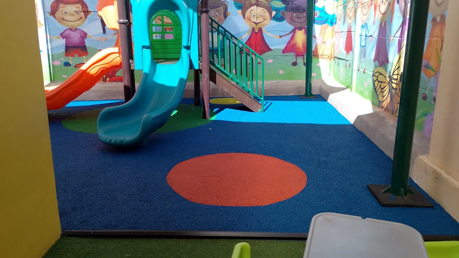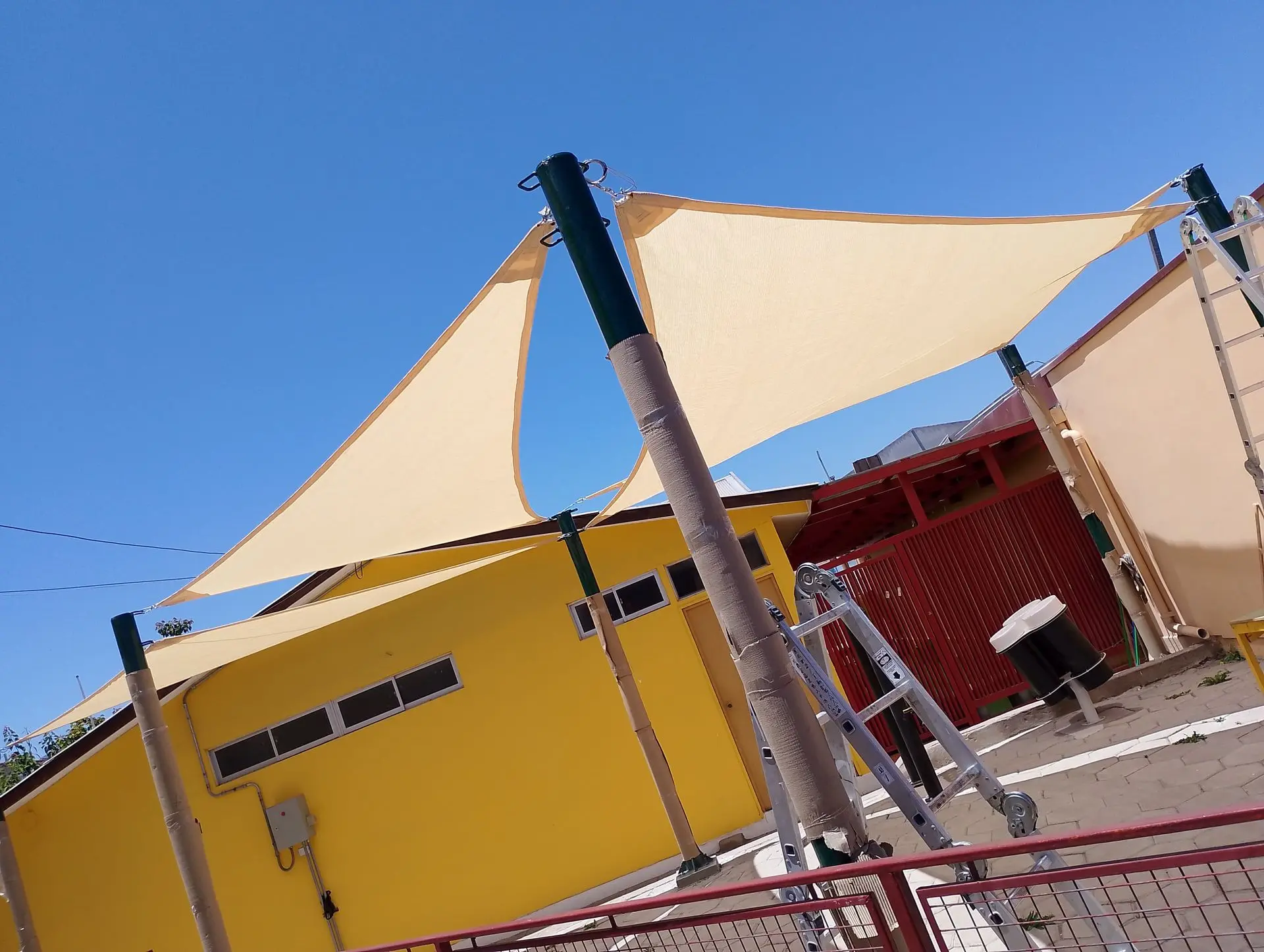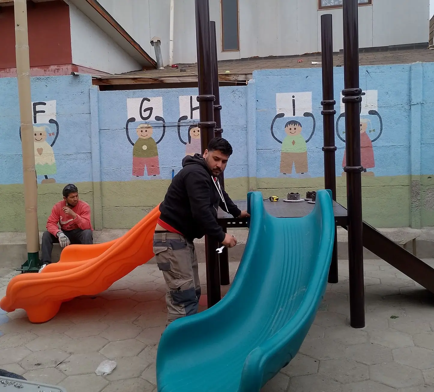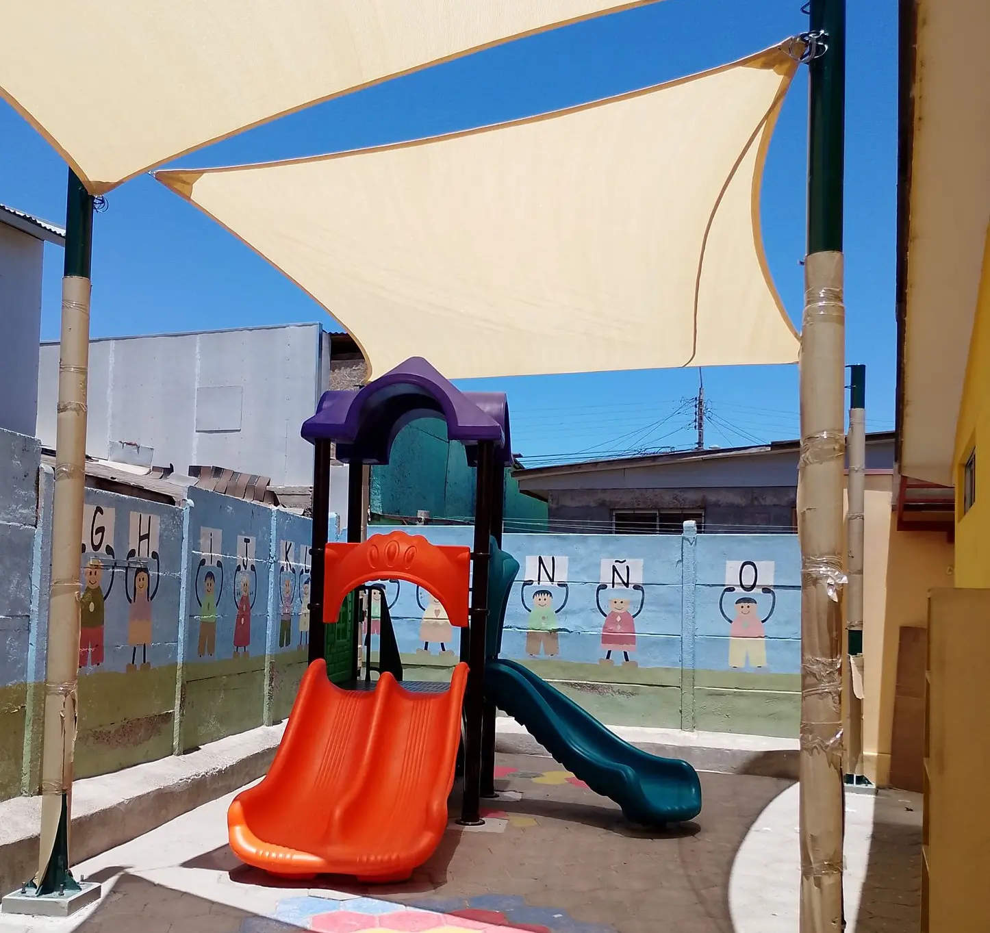Bajo el cielo de la Región de Coquimbo, la radiación solar es un desafío constante. Por ello, nuestra intervención comenzó con la instalación de toldos vela, que no solo filtran la luz, sino que crean una estética arquitectónica moderna. Pero la verdadera revolución está bajo los pies: un piso de caucho continuo que transforma cada caída en un rebote seguro y cada juego en una experiencia de confort.